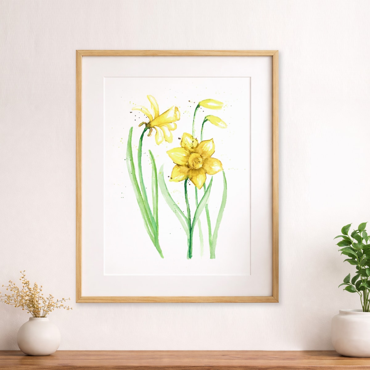 Original akvarell av et av de første vårtegnene, påskeliljen. Blomsten er malt i gult og grønne toner, med innslag av brunt.